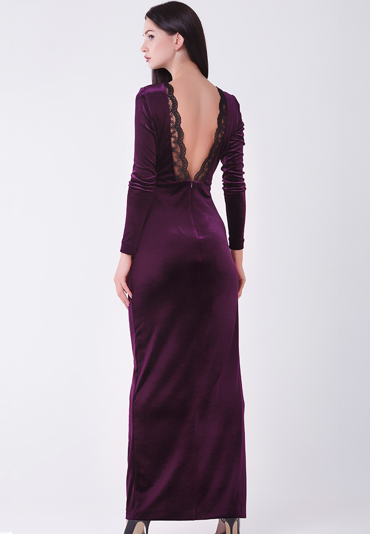 Вечерние платье с разрезом на правой стороне. Застегивается сзади на молнии, украшено итальянским кружевом.